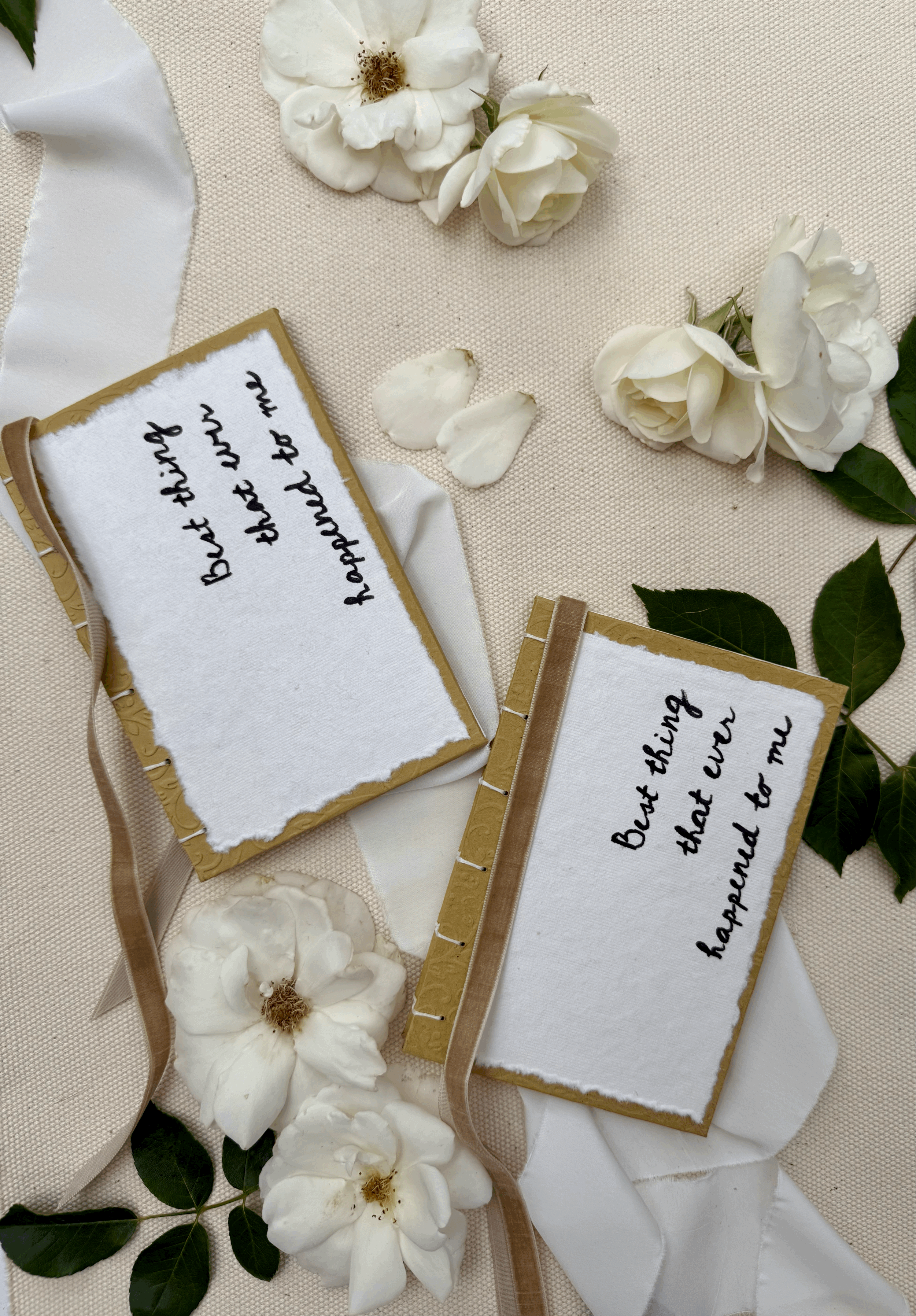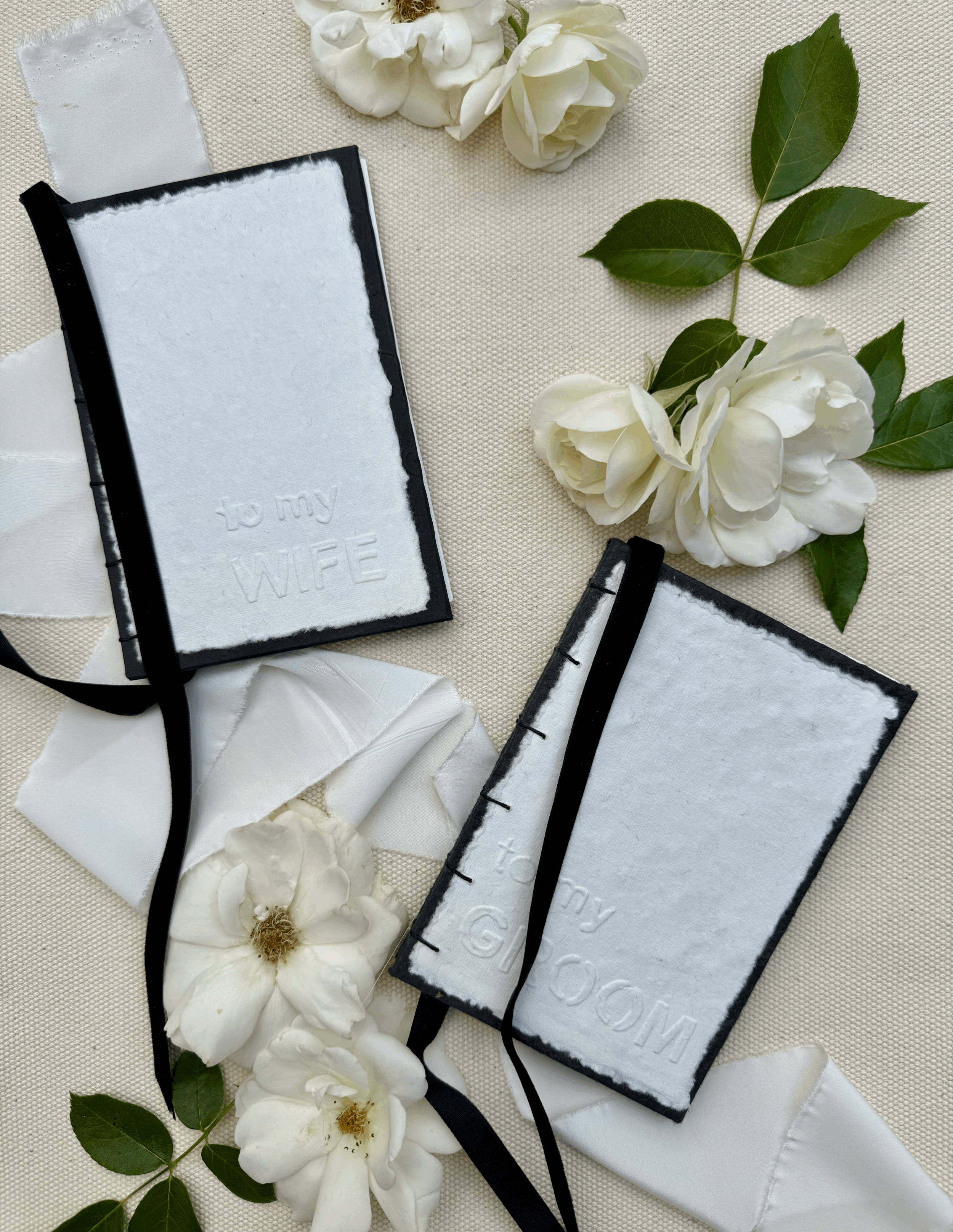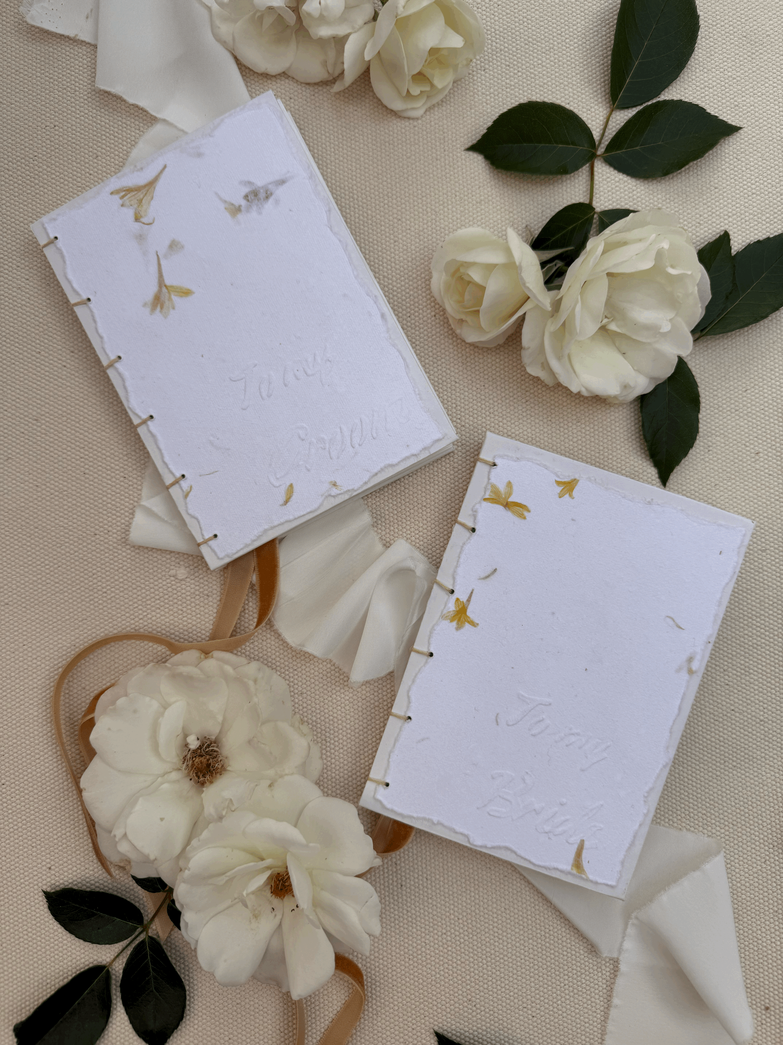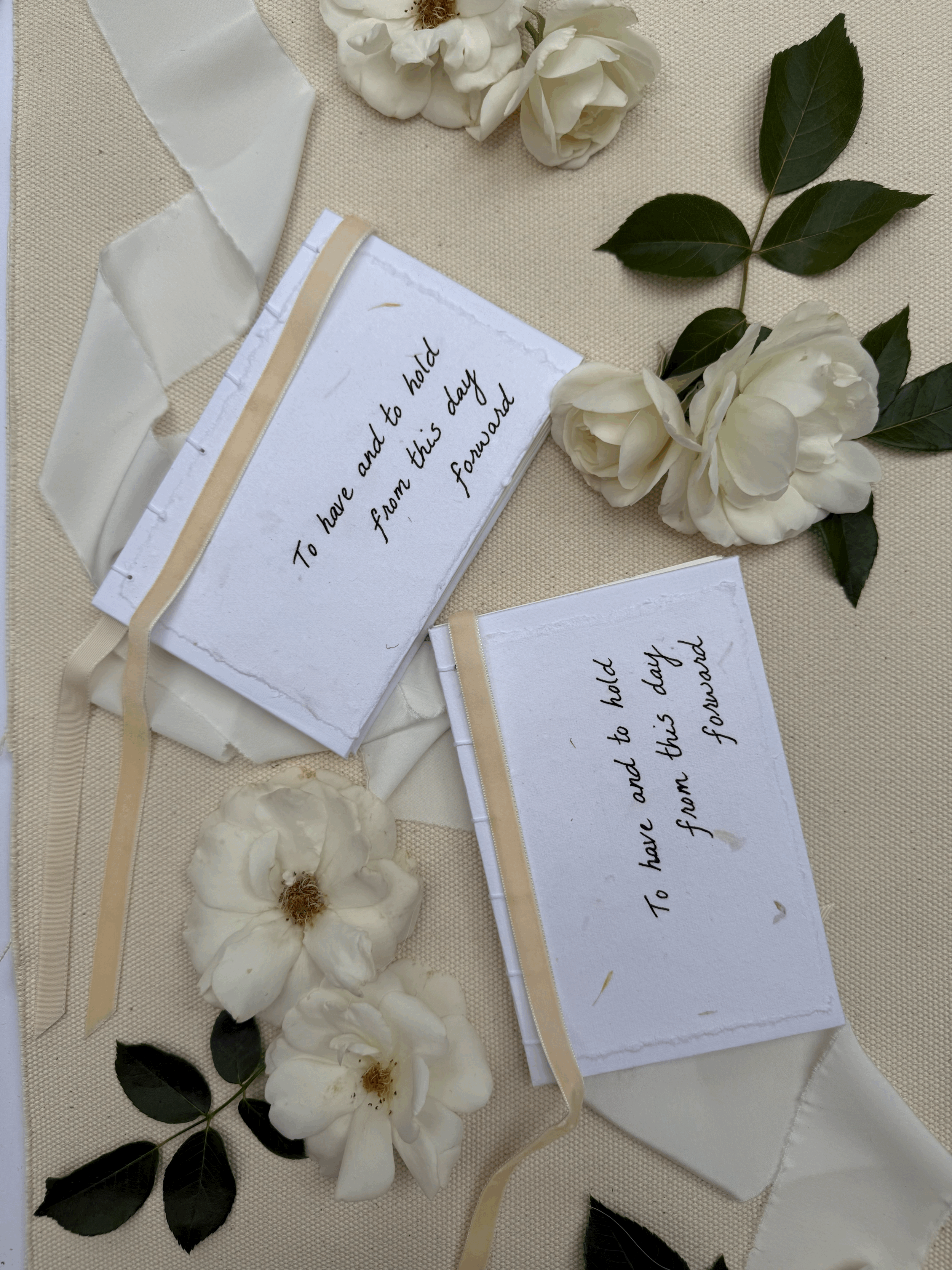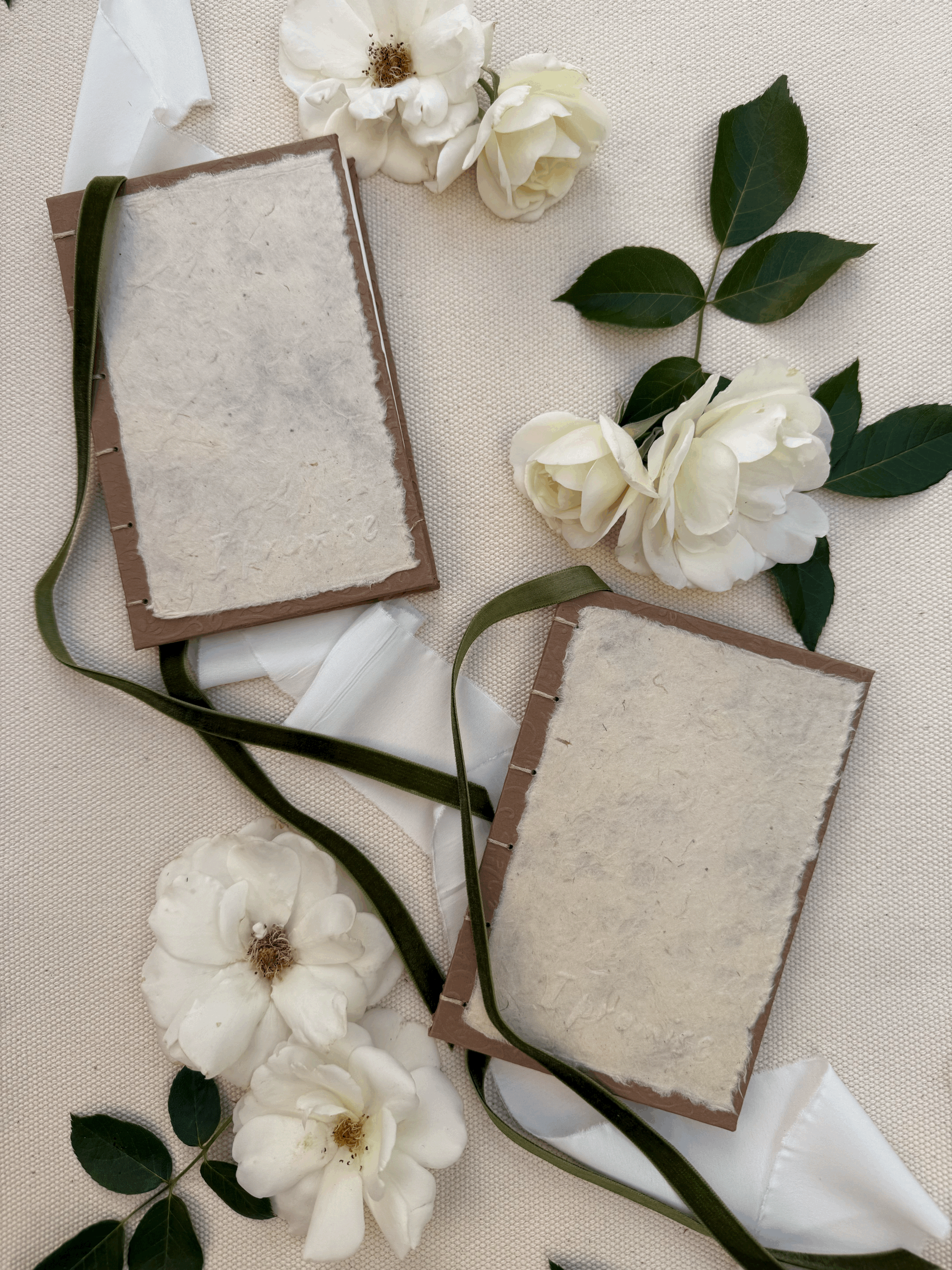 Celebrate your promises with intention. Our handmade vow books are lovingly crafted using traditional bookbinding techniques and premium, heirloom-quality materials. Each vow book features a handmade paper cover, hand-stitched binding, and your choice of silk or velvet ribbon, designed to be as timeless as the words written inside.